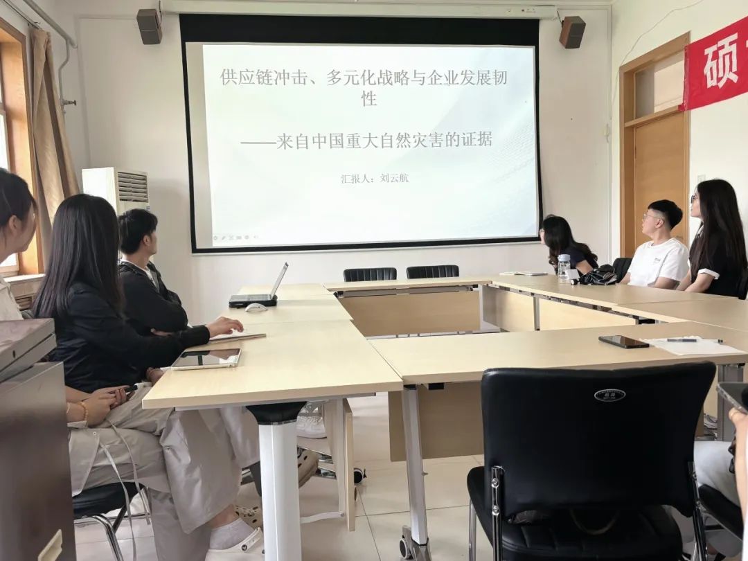 其次,刘云航同学分享了来自《中国工业经济》上的一篇文章,题目为《供应链冲击、多元化战略与企业发展韧性--来自中国重大自然灾害的证据》。刘同学讲到文章在梳理已有研究文献后,发现针对企业供应链配置应当多元化还是集中化,尚未取得一致结论。而文章认为论证多元化战略是否具备分散风险、维持企业韧性的效果,应当结合企业受到供应链冲击的具体情境。因此该文基于异质性企业采购模型,构建自然灾害引发供应链冲击影响企业中间投入品采购的理论框架,并探讨供应链多元化的作用。在实证分析上,刘同学讲述了该文的基准回归结果、稳健性检验方法以及机制检验结果。最后,刘同学分享了该文的研究结论与启示。