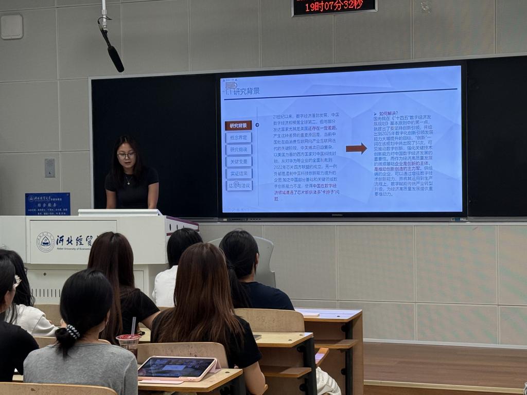 刘敏同学分享了自己所写的一篇文章:《数字经济对京津冀吸引FDI的影响研究》。首先,刘同学说明了京津冀地区数字产业的发展现状。当前数字经济是经济增长的关键力量,而京津冀地区数字产业呈现出“北京密集、天津过渡、河北外围”的阶梯分布,FDI呈现核心—外围的落差。刘同学针对这一现状进一步展开分析,该研究基于2010-2023年数据,通过基准回归、区域异质性等实证分析验证数字经济发展水平对京津冀吸引FDI有显著正向影响,并针对此结论提出要强化数字经济协同发展机制等建议,夯实吸引FDI的硬件基础。