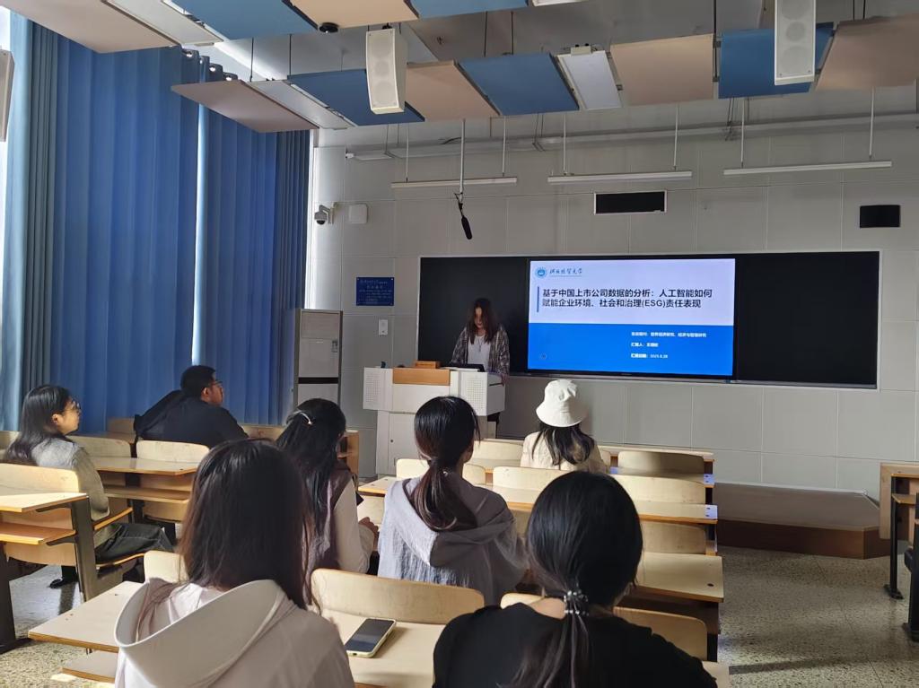 第一,王玥钦同学分享的文章主题为《基于中国上市公司数据的分析:人工智能如何赋能企业环境、社会和治理(ESG)责任表现》,并从引言与研究背景、核心研究发现、作用机制、异质性分析和研究结论等五个方面进行介绍。王同学首先提出人工智能技术如何影响企业ESG责任履行这一核心问题;其次通过研究发现人工智能显著促进企业ESG责任表现,从绿色创新能力、信息透明度、内部运营效率这三个方面进行机制效应分析、通过划分企业类型进行异质性分析,并且进行了阈值效应分析;最后得出人工智能技术使用是企业提升ESG表现的重要战略工具这一结论,并针对企业、政策制定者和投资者提出相应建议。