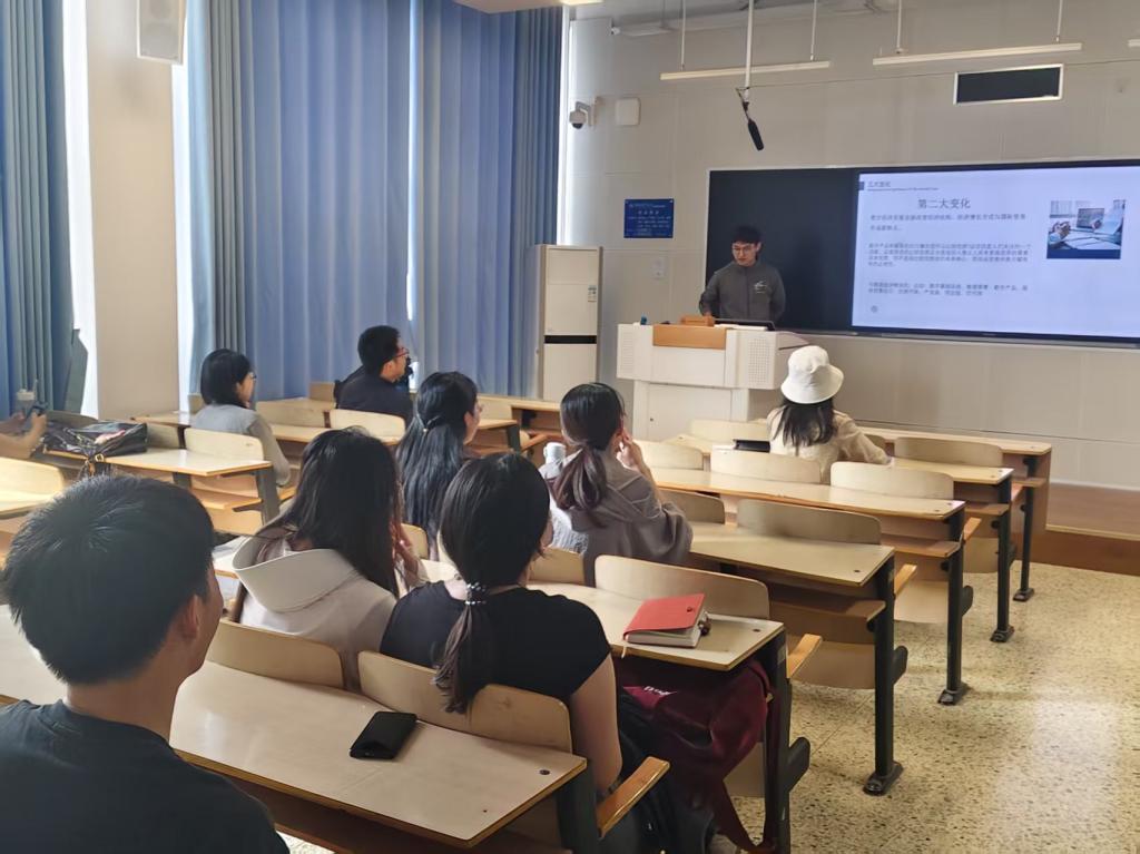 第三,代忠杰同学分享的文章是《浅析世界经济方向未来研究课题》,代同学主要针对世界经济方向三大重要变化进行分析。首先,第一大变化主要是指经济全球化发展受阻,逆全球化政策导致世界经济运行机制深刻变化,所以价值链、产业链与供应链、国际分工等仍然是未来能打的主题;其次,数字经济发展全面改变经济界结构,经济增长方式与国际贸易形成新特点,因此与数字经济相关的,如数字基础设施、数据要素、服务贸易出口仍然能够进行深入研究;最后,当前人工智能发展对经济产生深刻影响,国际分工体系正在发生重大变革,所以人工智能是当前研究的新热点。
