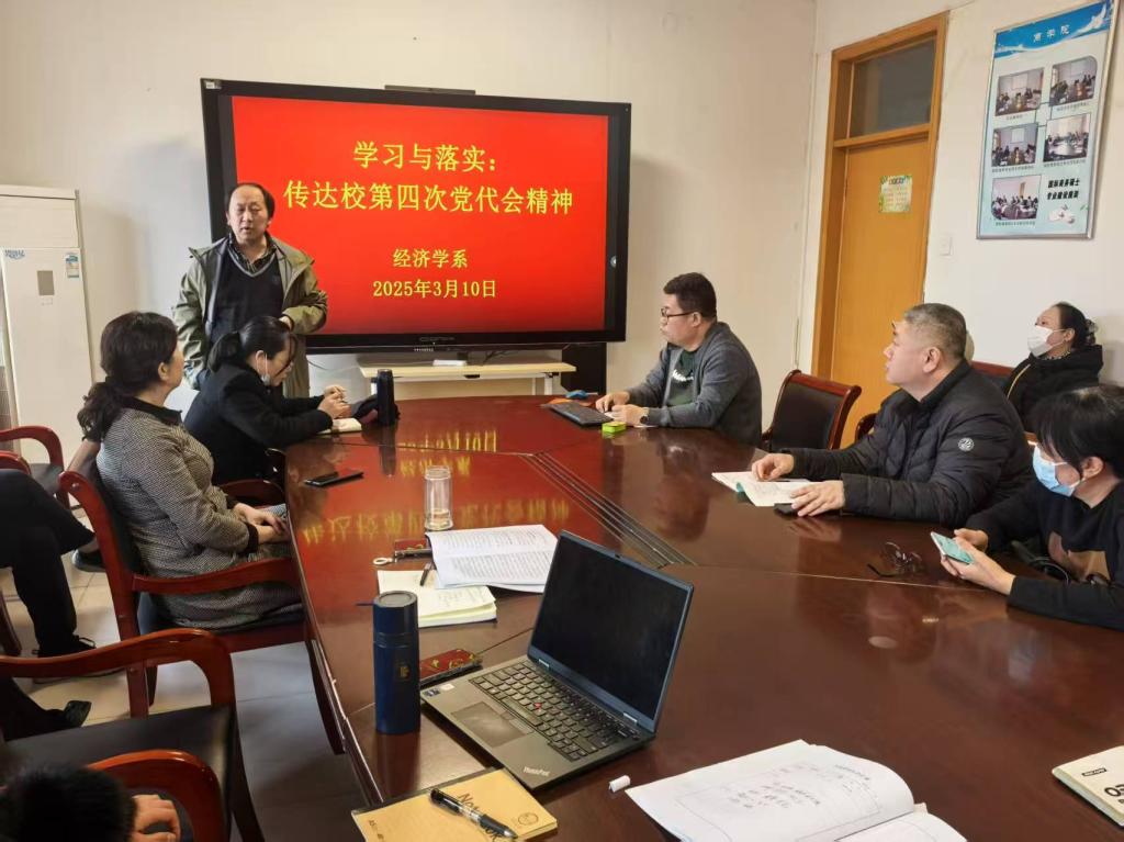 副院长单海鹏与经济学系教师共同学习学校第四次党代会精神。单海鹏结合党代会报告对教学、科研和社会服务等方面提出的要求,围绕专业发展面临的形势、产教融合创新平台建设、推动有组织科研、推进校企合作和服务县域经济发展等主题与老师们进行深入交流研讨。