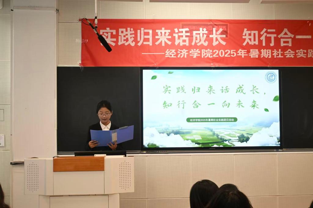 随后,活动进入实践成果分享环节。白鹤妍同学系统讲解了2025年暑期社会实践的整体概况。她介绍,本次实践面向全院学生,共引领1423名师生参与,组建了22支集中实践小分队与64支分散实践小分队,足迹覆盖张家口、石家庄等多座城市。她详细阐述了“三下乡”集中实践在文化传承、科技创新、乡村振兴等领域的丰硕成果,以及“返家乡”分散实践和“云支教”在服务基层、教育帮扶方面的显著成效。
