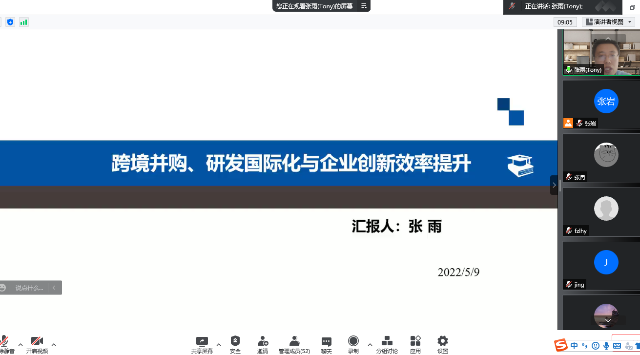 5月9日,商学院张雨博士于线上作了题为“跨境并购、研发国际化与企业研发效率提升”的学术报告。报告由商学院副院长刘振滨主持,校内外50余名师生参加了本次报告会。