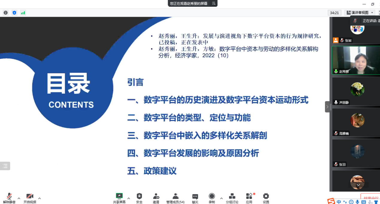10月20日,福建师范大学赵秀丽教授应商学院邀请,于线上作了题为“数字平台的历史演进、功能定位及关系解剖”的学术报告。报告由芦丽静老师主持,学院五十余名师生参加。