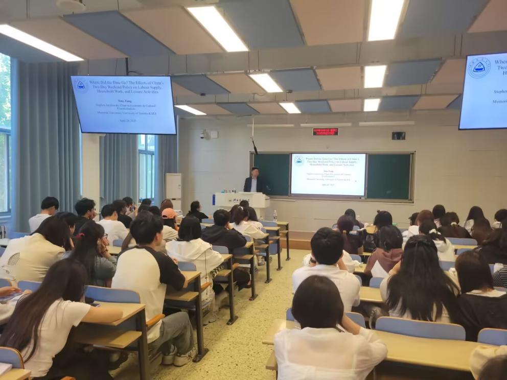4月29日,yl23455永利集团邀请纽芬兰纪念大学方涛教授在第三教学楼作了题为“时间去哪儿了?中国双休日政策对劳动力供给、家务劳动和休闲活动的影响”的学术报告。报告由王法涛副院长主持,我校百余名师生参加。