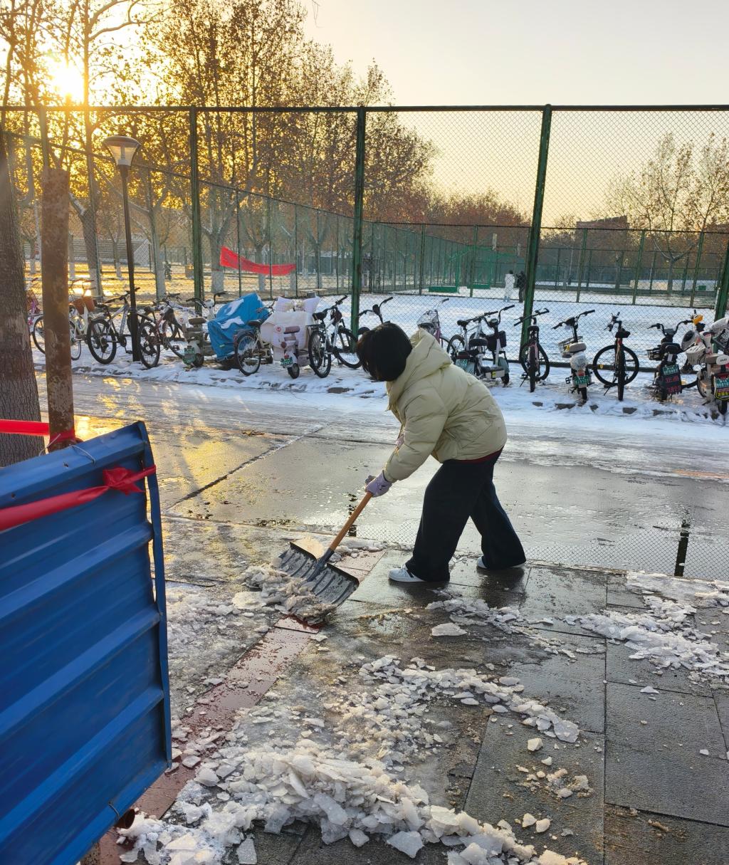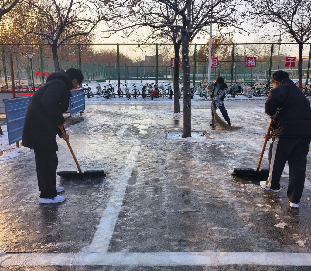 学院始终重视劳动教育与实践服务的深度融合,此次扫雪活动既是应对突发天气的应急行动,更是学院劳动教育的生动实践课堂。前期,学院对活动安全、工具准备、区域划分进行了周密部署。活动开始前,生活权益部负责人科学划分清扫区域、明确职责分工,让劳动实践既有 “分工” 更有 “协作”。第一组成员聚焦主干道核心区域,铲除压实积雪与顽固薄冰,保障通行主干道畅通;第二组成员负责台阶、人行道等细节区域,手持扫帚细致清扫残留积雪,同时顺手归拢散落在路边的细小杂物,避免积雪融化后杂物堆积影响通行,真正实现清扫无死角、安全无盲区。他们用实际行动诠释了“以劳树德、以劳增智、以劳强体、以劳育美” 的劳动教育内涵。